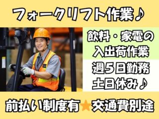 | 業務内容 | ==仕事内容== リーチリフトを使った家電製品(テレビ・洗濯機・エアコン等)の入出庫作業をお任せします! 【ここが推しポイント!】 ・ほぼ乗りっぱなしなので沢山乗れちゃいます! ・服装自由です!動きやすい服装で働けます(^^♪ ・高時給なのでがっつり稼げます! ・残業希望者大歓迎!たくさん稼ぎたい方にオススメ ==給与== 時給1600円+交通費15000円/月 急な出費でも大丈夫!嬉しい週/日払いあり♪ ==勤務地== 千葉浦安市港 ==最寄り駅== 東京メトロ「浦安駅」から送迎バスで20分 JR「新浦安駅」から送迎バスで10分 ※バイク・自転車通勤OK ==働き方== 週5日勤務(月曜固定休み)シフト制 ==勤務時間== 9:00~18:00(休憩1時間) ※早出をお願いする場合もございます ==雇用形態== 派遣社員 |
