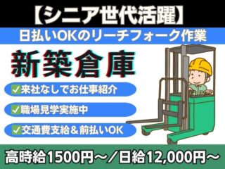 \時給1500円♪/リーチフォーク作業員|日払い|シニア歓迎