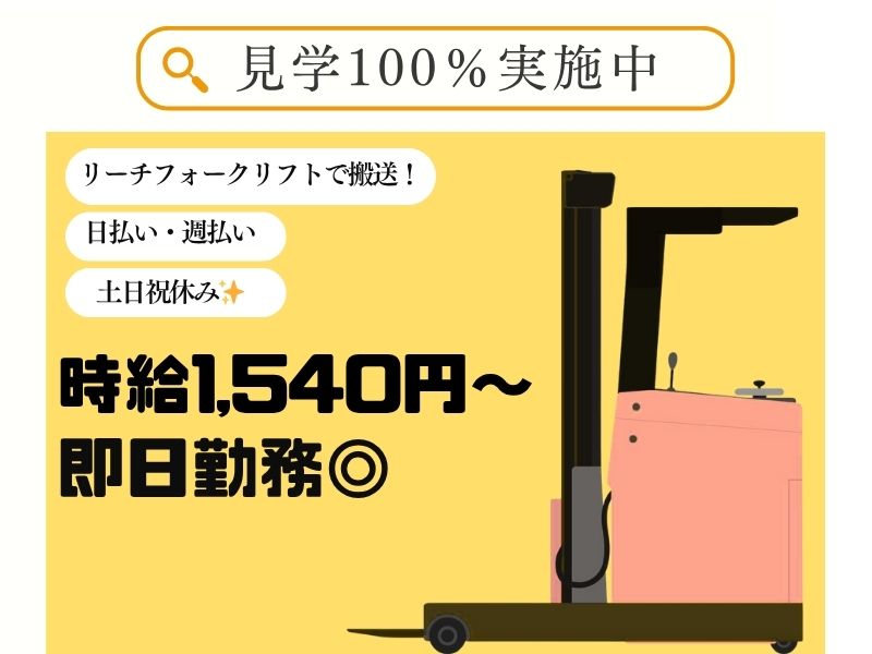 - 「日給13,000円以上!?」室内リーチフォーク作業/日払い/準夜勤